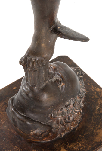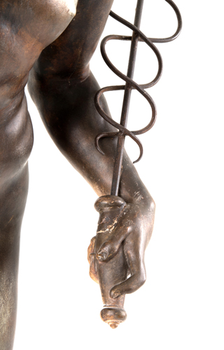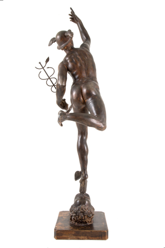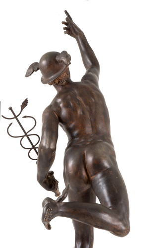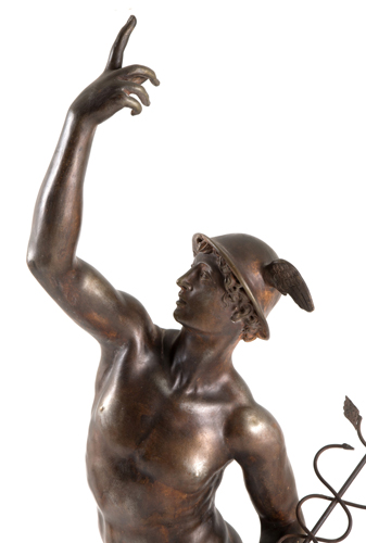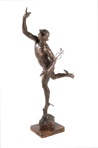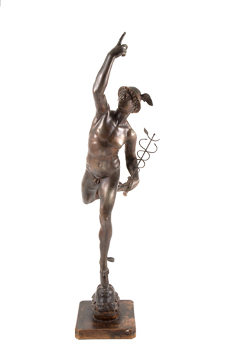 Sculpture in burnished terra di signa fake bronze depicting ''MERCURY''. Hallmarked on the base. Late 19th-early 20th century. Defects. Height approx. 184 cm. Scultura in terra di signa brunita finto bronzo raffigurante ''MERCURIO''. Punzonata sulla base. Fine XIX-inizi XX secolo. Difetti. Alt. cm. 184 ca.