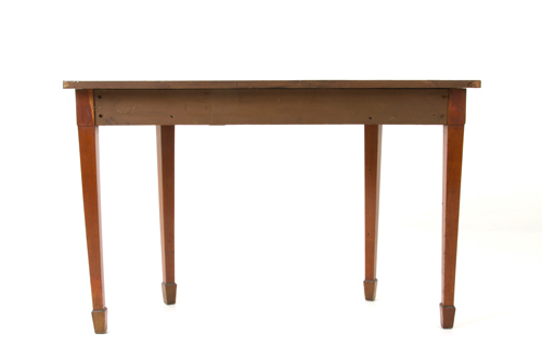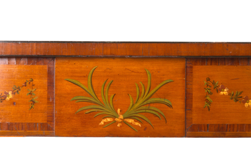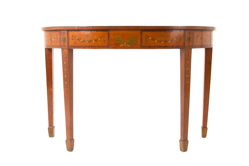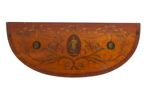 Crescent console in painted wood with neoclassical motifs on the top. Sheraton. 19th century. Minor defects and missing parts. 77x119.5x49 cm approx. Consolle a mezzaluna in legno dipinto a motivi neoclassici sul piano. Sheraton. XIX scolo. Lievi difetti e mancanze. 77x119,5x49 cm ca.