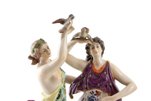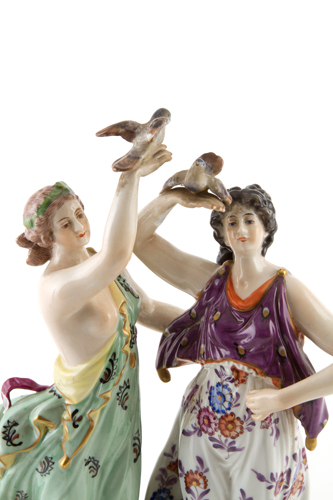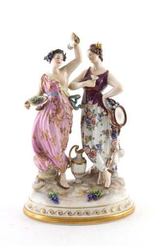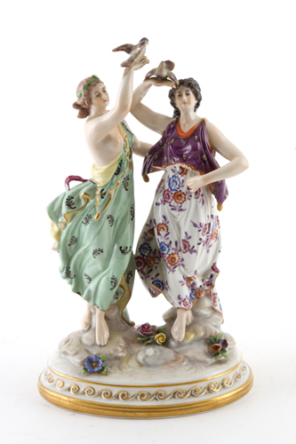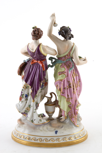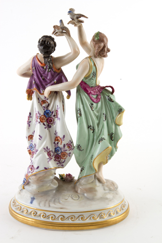 Pair of polychrome porcelain sculptures depicting "DANCING GIRLS". CAPODIMONTE manufacture. Marked on the back. 20th century. Small losses. 30x18x11 cm approx. Coppia di statuette in porcellana policroma raffiguranti "FANCIULLE DANZANTI". Manifattura CAPODIMONTE. Marcate sul retro. XX secolo. Piccole mancanze. 30x18x11 cm ca.