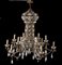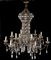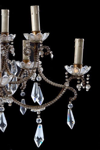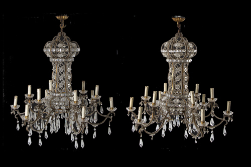 Coppia di lampadari dodici luci in ferro dorato con perline in vetro a motivi geometrici. Fine XIX secolo. Lievi difetti e mancanze.
