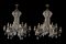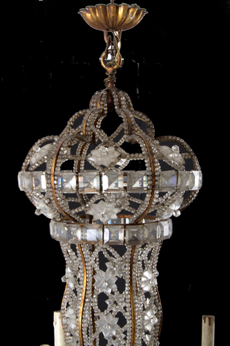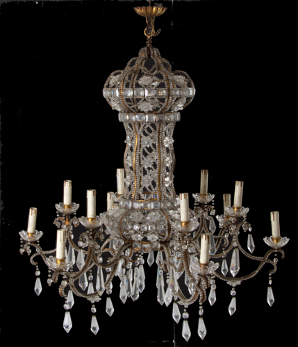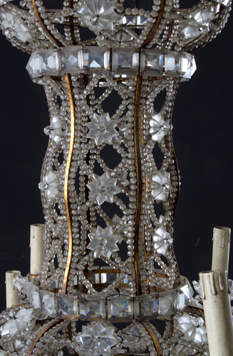 Pair of twelve-light chandeliers in gilded iron with geometric patterned glass beads. Late 19th century. Minor defects and missing parts.