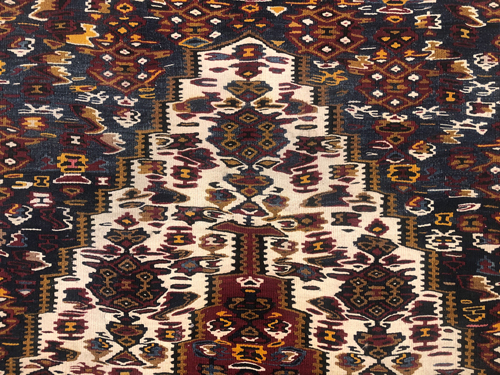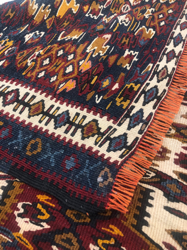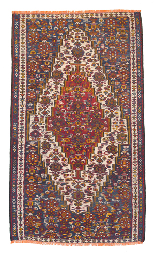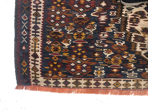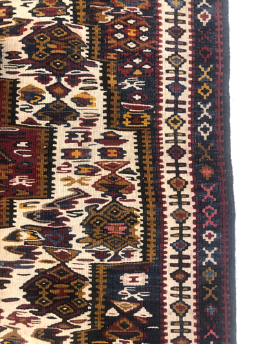 Kilim Sirjan. Persia. Early 20th century. Excellent condition, missing headers. 233x138 cm approx. Kilim Sirjan. Persia. Inizi XX secolo. Ottimo stato di conservazione, mancanze nelle testate. 233x138 cm ca.