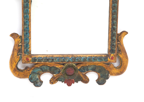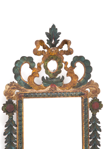 Small mirror in carved, lacquered and gilded wood with frame decorated with scroll friezes and festoons. Tuscany. Late 19th century. Defects. 91.5x42x9 cm approx. Piccola specchiera in legno intagliato, laccato e dorato con cornice decorata da fregi a volute e festoni. Toscana. Fine XIX secolo. Difetti. 91,5x42x9 cm ca.