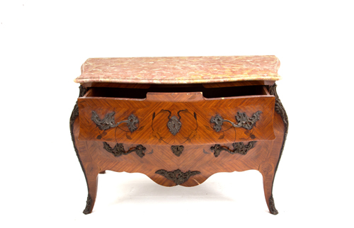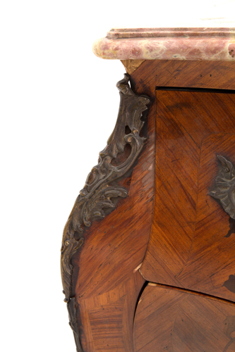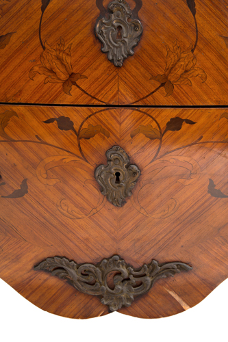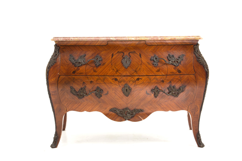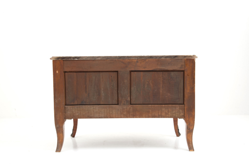 Chest of drawers veneered and inlaid with floral motifs in various woods with bronze fittings and marble top. Louis XV style. Minor defects and missing parts. 85x127x64,5 Comò lastronato e intarsiato a motivi floreali in legni vari con guarnizioni in bronzo e piano in marmo. Stile Luigi XV. Lievi difetti e mancanze. 85x127x64,5