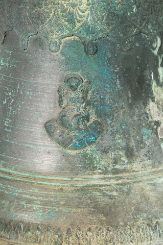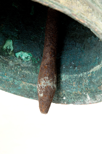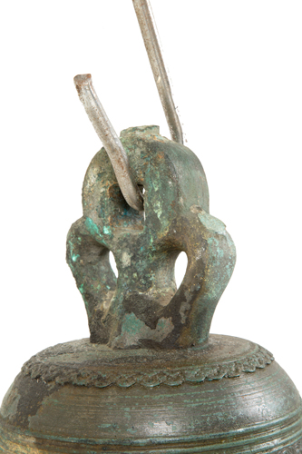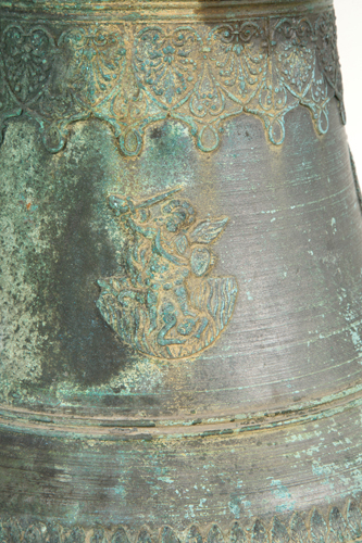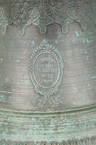 Bronze bell decorated with banded festoons, the image of Jesus the Redeemer and Saint Michael the Archangel. Signed SALVATORE NOBILIONE, Naples 1896 on the side. 48x35 cm approx. Campana in bronzo decorata con festoni a fascia, l'immagine di Gesù Redentore e San Michele Arcangelo. Firmata SALVATORE NOBILIONE, Napoli 1896 sul fianco. 48x35 cm ca.