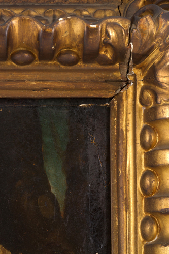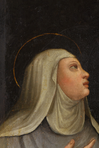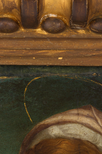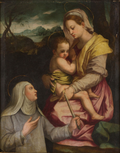 Oil painting on panel depicting "MADONNA WITH CHILD AND SAINT". Second half of the 16th century. In a beautiful period frame. 64x52 cm approx. Dipinto olio su tavola raffigurante "MADONNA CON BAMBINO E SANTA". Seconda metà del XVI secolo. In bella cornice d'epoca. 64x52 cm ca.
