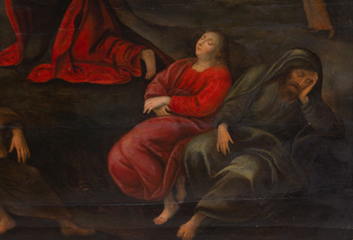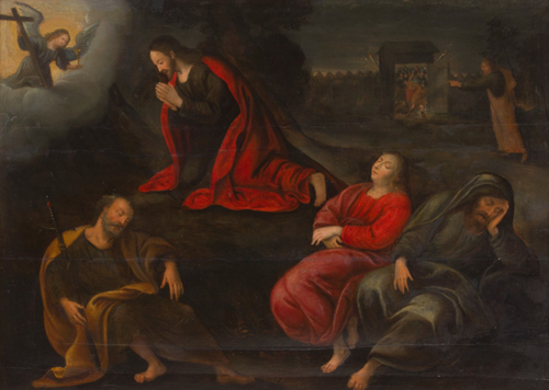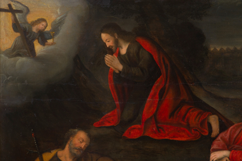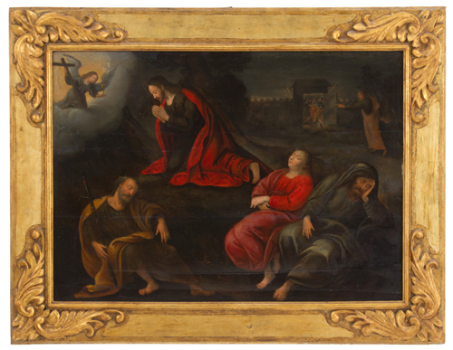 Oil painting on panel depicting "JESUS IN THE OLIVE GARDEN". Late 16th-early 17th century. Framed. Restoration. 76x105 cm approx. Dipinto olio su tavola impalchettata raffigurante "GESU' NELL'ORTO DEGLI ULIVI". Fine XVI-inizi XVII secolo. In cornice. Restauri.  76x105 cm ca.