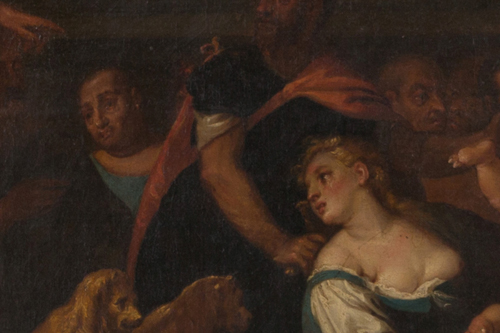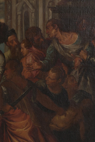 CARLO CALIARI (attr.)(Venezia 1570-Venezia 1596). Oil painting on canvas depicting ''THE JUDGMENT OF SOLOMON''. Late 16th century. In a non-contemporary frame. 113x168 cm approx. CARLO CALIARI (attr.)(Venezia 1570-Venezia 1596). Dipinto olio su tela raffigurante''IL GIUDIZIO DI SALOMONE''. Fine XVI secolo. In cornice non coeva. 113x168 cm ca
