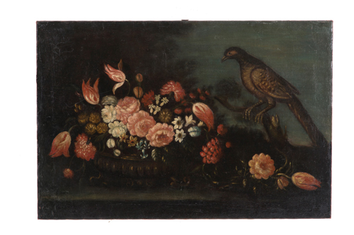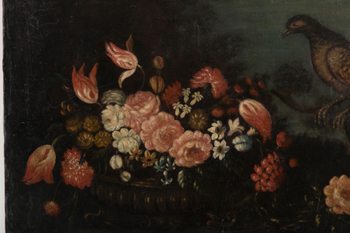 Oil painting on canvas depicting "STILL LIFE WITH FLOWERS AND BIRD". XVII century. Already relined and re-stretched. 65x96.5 cm approx. Dipinto olio su tela raffigurante "NATURA MORTA CON FIORI E VOLATILE". XVII secolo. Già rintelato e rintelaiato. 65x96,5 cm ca.