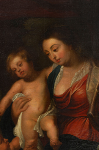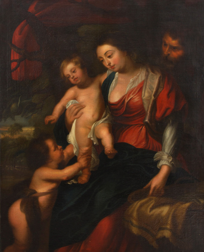 FLEMISH MASTER OF THE 17TH CENTURY. Oil painting on canvas depicting "HOLY FAMILY WITH THE LITTLE ST. JOHN". In a carved and gilded wooden frame. Already relined and re-stretched. Minor restorations. 148x121 cm approx. MAESTRO FIAMMINGO DEL XVII SECOLO. Dipinto olio su tela raffigurante "SACRA FAMIGLIA CON SAN GIOVANNINO". In cornice in legno intagliato e dorato. Già rintelato e rintelaiato. Lievi restauri. 148x121 cm ca.