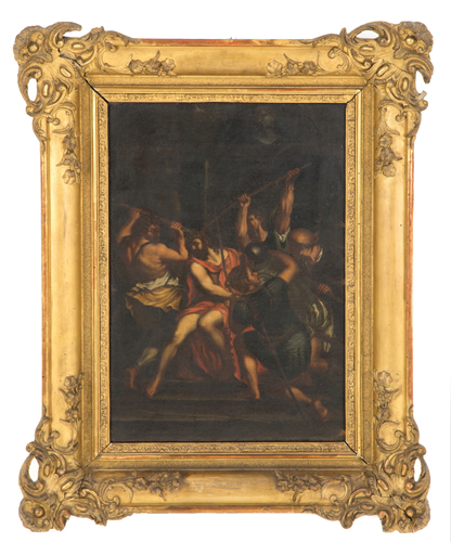 Oil painting on canvas depicting "CROWNED WITH THORNS". From Tiziano. 17th century. In a gilded pastiglia frame. Already relined and re-stretched. 55.5x38 cm approx. Dipinto olio su tela raffigurante "INCORONAZIONE DI SPINE". Da Tiziano. XVII secolo. In cornice di pastiglia dorata. Già rintelato e rintelaiato. 55,5x38 cm ca.