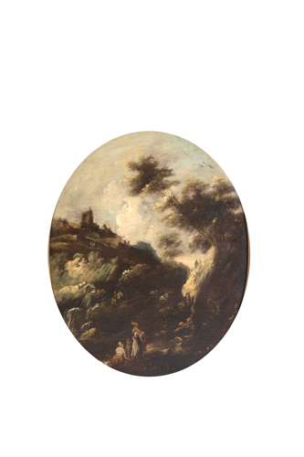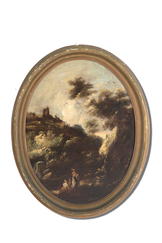 MAESTRO GENOVESE DEL XVIII SECOLO. Dipinto olio su tela raffigurante "PAESAGGIO BOSCHIVO CON PERSONAGGI". In cornice. Già rintelato e rintelaiato.