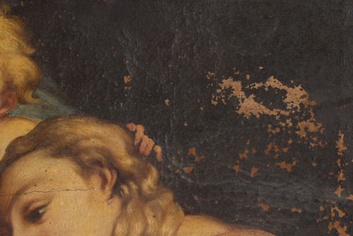 Oil painting on canvas depicting "MYSTIC MARRIAGE OF SAINT CATHERINE WITH ANGEL". 18th century. In coeval frame. Defects and restorations. 64x83.5 cm approx. Dipinto olio su tela raffigurante "SPOSALIZIO MISTICO DI SANTA CATERINA CON ANGELO". XVIII secolo. In cornice coeva. Difetti e restauri. 64x83,5 cm ca.