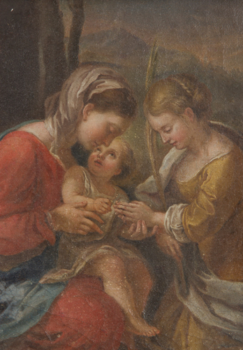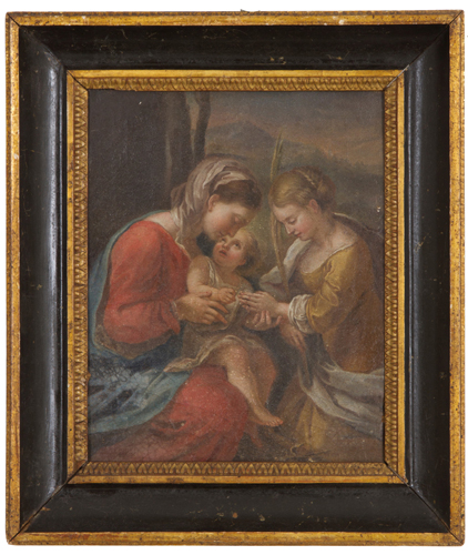 Oil painting on canvas depicting "MYSTIC MARRIAGE OF SAINT CATHERINE". Second half of the 18th century. In a contemporary lacquered and gilded frame. Defects and restorations. 26x20 cm approx. Dipinto olio su tela raffigurante "MATRIMONIO MISTICO DI SANTA CATERINA". Seconda metà del XVIII secolo. In cornice coeva laccata e dorata. Difetti e restauri. 26x20 cm ca.