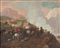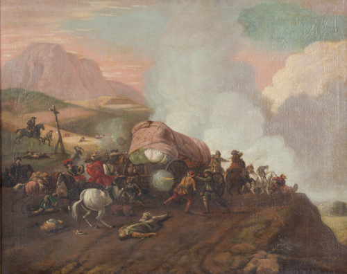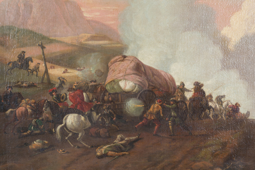 Oil painting on canvas depicting "BATTLE". 18th century. In a gilded frame. Already relined and re-stretched. Restoration. 64x78 cm approx. Dipinto olio su tela raffigurante "BATTAGLIA". XVIII secolo. In cornice dorata. Già rintelato e rintelaiato. Restauri. 64x78 cm ca.