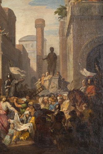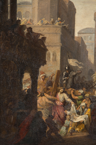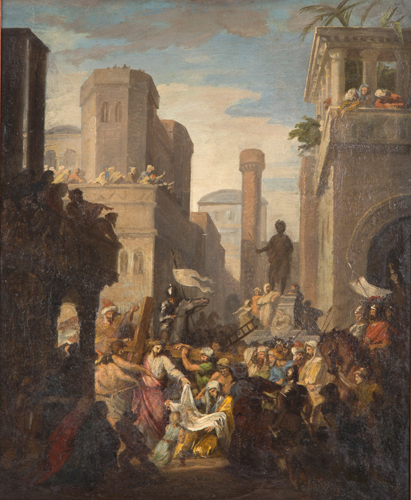 VENETIAN SCHOOL, EARLY 19TH CENTURY. Oil painting on canvas depicting "SIXTH STATION OF THE VIA CRUCIS - VERONICA WIPES JESUS". Framed. Already relined. 53x44 cm approx. SCUOLA VENETA DEGLI INIZI DEL XIX SECOLO. Dipinto olio su tela raffigurante "VI STAZIONE DELLA VIA CRUCIS - GESU' ASCIUGATO DALLA VERONICA". In cornice. Già rintelato. 53x44 cm ca.