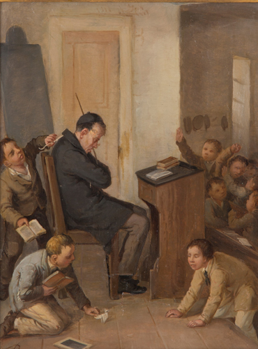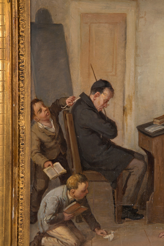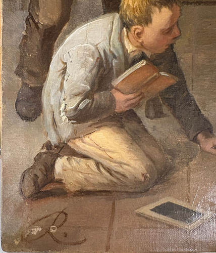 Oil painting on canvas depicting "CHILDREN AT SCHOOL". Signed R. lower left. 19th century. In a gilded frame. Minor restorations. 39.7x30.3 cm approx. Dipinto olio su tela raffigurante "BAMBINI A SCUOLA". Siglato R. in basso a sinistra. XIX secolo. In cornice dorata. Lievi restauri. 39,7x30,3 cm ca.
