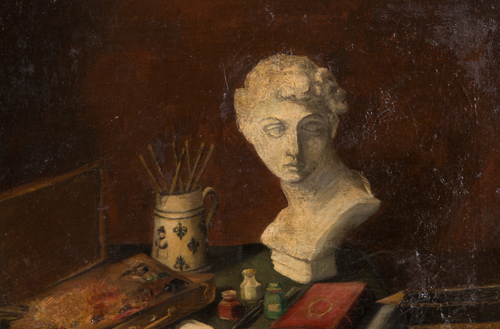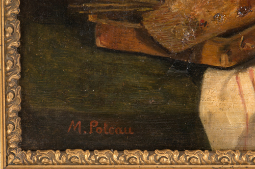 Oil painting on canvas depicting "ARTIST'S STUDIO". Signed M. POTCAU lower left. Late 19th-early 20th century. In a gilded frame. Restorations. 46x61 cm approx. Dipinto olio su tela raffigurante "STUDIO D'ARTISTA". Firmato M. POTCAU in basso a sinistra. Fine XIX-inizi XX secolo. In cornice dorata. Restauri. 46x61 cm ca.