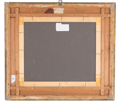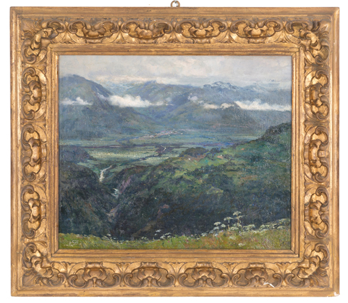 RICCARDO GALLI (Milano 1869-Barzio 1944). Oil painting on panel depicting "MOUNTAIN LANDSCAPE". Signed lower left. In a gilded frame. With partial cartouche of the Permanente gallery, Milan on the back. 50x60 cm approx. RICCARDO GALLI (Milano 1869-Barzio 1944). Dipinto olio su tavola raffigurante "PAESAGGIO MONTANO". Firmato in basso a sinistra. In cornice dorata. Con parziale cartiglio della Permanente di Milano sul retro. 50x60 cm ca.