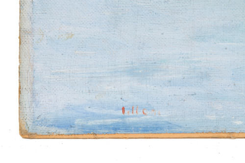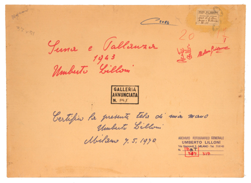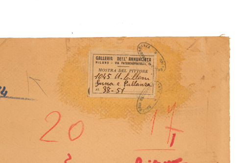 UMBERTO LILLONI (Milano 1898-1980). Oil painting on canvas applied on cardboard entitled "SUNA E PALLANZA". Signed lower left. Countersigned, with title, authentication signed by the artist, number of the General Photographic Archive of Umberto Lilloni Milan and stamp of the Galleria Annunciata on the back. 1943. Framed. 37x51 cm approx. UMBERTO LILLONI (Milano 1898-1980). Dipinto olio su tela applicata su cartone intitolato "SUNA E PALLANZA". Firmato in basso a sinistra. Controfirmato, con titolo, autentica firmata dall'artista, numero dell'Archivio Fotografico Generale di Umberto Lilloni Milano e timbro della Galleria Annunciata sul retro. 1943. In cornice. 37x51 cm ca.
