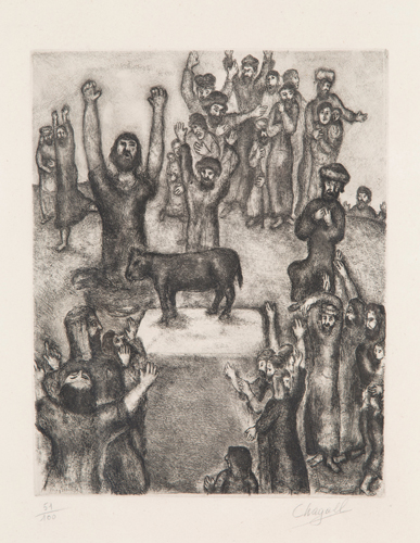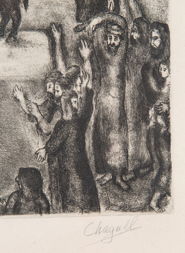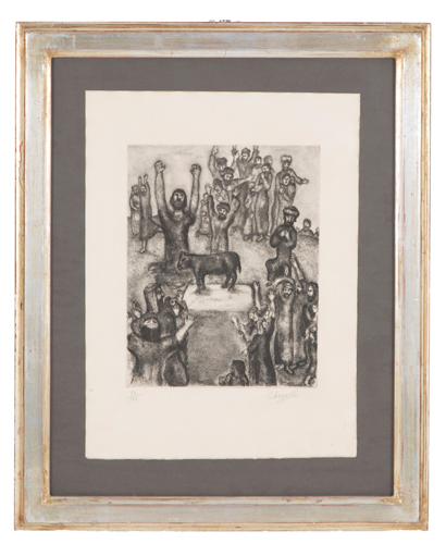 MARC CHAGALL (Liosno 1887-Saint-Paul-de-Vence 1985). Engraving depicting "SACRIFICE". Signed lower left, countersigned lower right. Biblical series. 1967. Numbered 51/100. Framed. With certificate of guarantee from Il Torchio di Porta Romana, Piacenza. 44x33.5 cm approx. MARC CHAGALL (Liosno 1887-Saint-Paul-de-Vence 1985). Incisione raffigurante "SACRIFICIO". Firmata in basso a sinistra, controfirmata in basso a destra. Serie biblica. 1967. Esemplare 51/100. In cornice. Con certificato di garanzia de Il Torchio di Porta Romana, Piacenza. 44x33,5 cm ca.