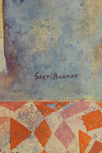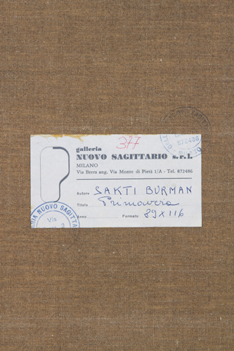 SAKTI BURMAN (Calcutta 1935). Oil painting on canvas titled "SPRING". Signed lower right. Countersigned and with cartouche of the Galleria Nuovo Sagittario, Milan on the back. Framed. 116x89 cm approx. SAKTI BURMAN (Calcutta 1935). Dipinto olio su tela intitolato "PRIMAVERA". Firmato in basso a destra. Controfirmato e con cartiglio della Galleria Nuovo Sagittario, Milano sul retro. In cornice. 116x89 cm ca.