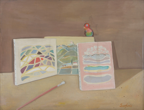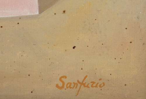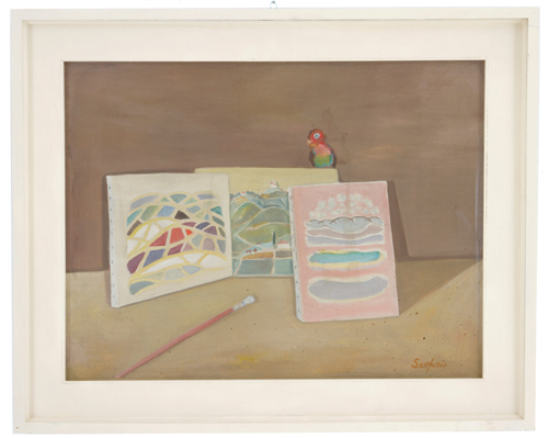 FURIO SANTINI SANFURIO. Painting "PAINTER'S WORKSHOP WITH PARROT"