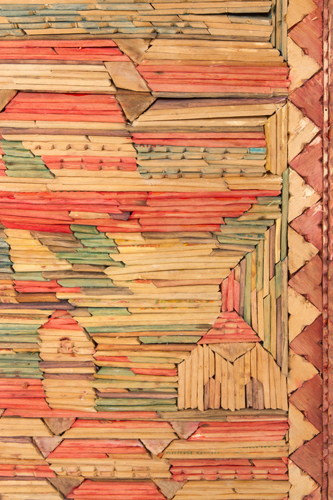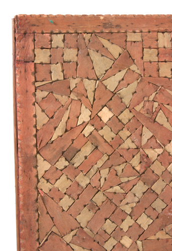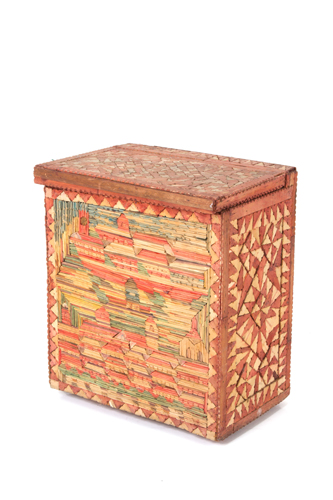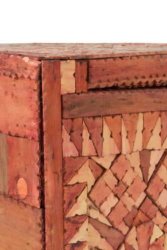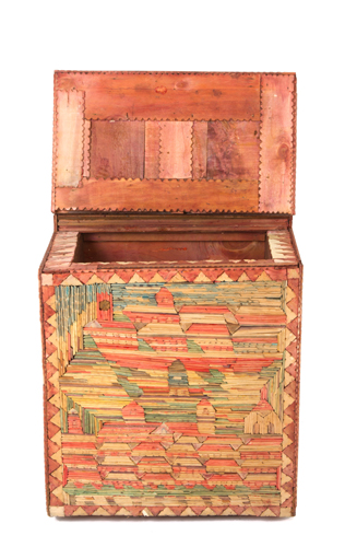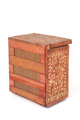 EGIDIO CUNIBERTI (Mondovì 1928-2006). Chest depicting "LANDSCAPE", made with colored wooden dowels. 1980s. Published in the artist's monograph edited by Bianca Tosatti, an art critic specialized in Art Brut, in 2012, p. 122, n. 55. 61x51x38 cm approx. EGIDIO CUNIBERTI (Mondovì 1928-2006). Cassapanca raffigurante "PAESAGGIO", realizzata con tasselli di legno colorati. Anni '80. Pubblicata sulla monografia dell'artista curata da Bianca Tosatti, critica d'arte specializzata in Art Brut, nel 2012, p. 122, n. 55. 61x51x38 cm ca.