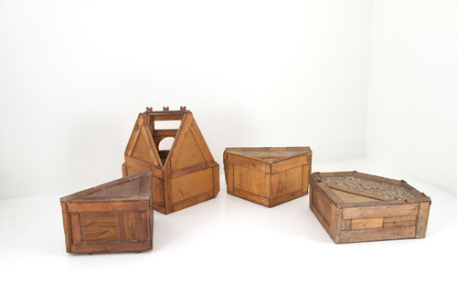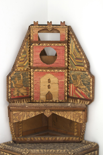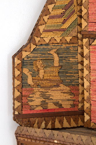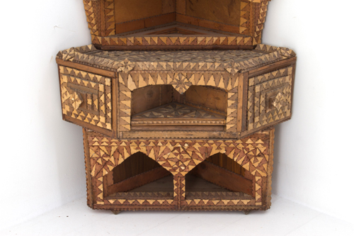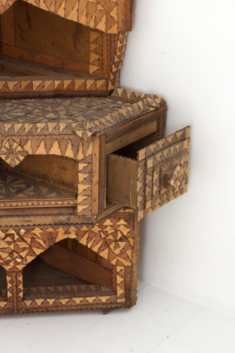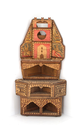 EGIDIO CUNIBERTI (Mondovì 1928-2006). Four-body corner cupboard with two figures and various decorations, made with colored wooden dowels. 1980s-1990s. Published in the artist's monograph edited by Bianca Tosatti, an art critic specialized in Art Brut, in 2012, p. 176, n. 90. 172x67x67 cm approx. EGIDIO CUNIBERTI (Mondovì 1928-2006). Angoliera a quattro corpi con due figure e varie decorazioni, realizzata con tasselli di legno colorati. Anni '80-'90. Pubblicata sulla monografia dell'artista curata da Bianca Tosatti, critica d'arte specializzata in Art Brut, nel 2012, p. 176, n. 90. 172x67x67 cm ca.