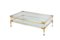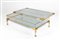 Plexiglass and brass coffee table with sliding top and plastic glass shelves. Signs of wear and tear over time. 39x132x76 cm approx. Tavolino in ottone e plexiglass con piano scorrevole e ripiani in vetro plastica. Segni di usura del tempo. 39x132x76 cm ca.