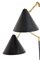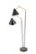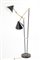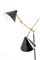 Two-light floor lamp in black painted metal and brass with painted metal lampshades. 1970s. Adjustable height. Height approx. 197 cm. Lampada da terra due luci in metallo verniciato nero e ottone con paralumi in metallo verniciato. Anni '70. Altezza regolabile. Alt. 197 cm ca.