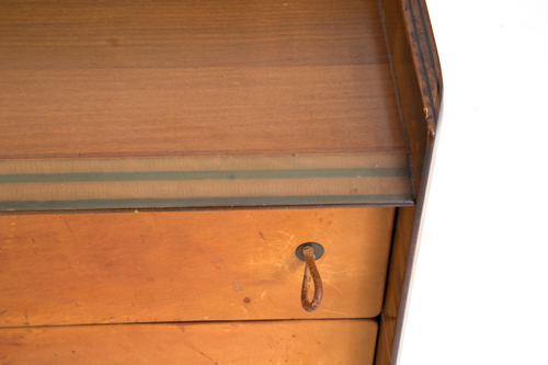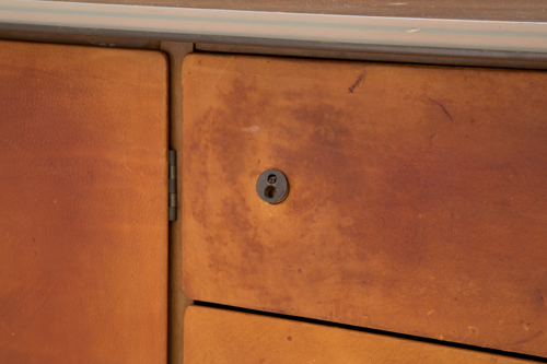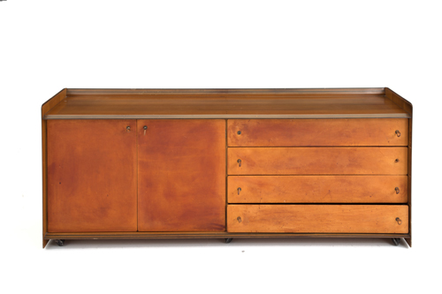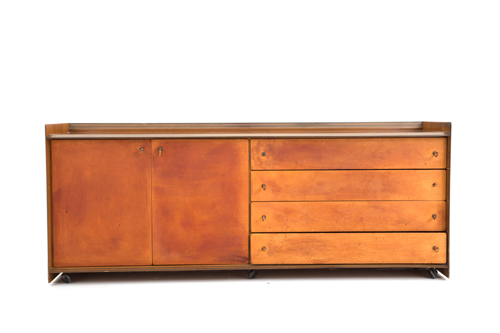 AFRA e TOBIA SCARPA. Sideboard Artona series in various woods with four drawers and two doors on the leather front. Production MAXALTO. 1970s. Defects and missing parts. 72x180x46.5 cm approx. AFRA e TOBIA SCARPA,Credenza serie Artona in legni vari con quattro cassetti e due ante sul fronte in cuoio. Produzione MAXALTO. Anni '70. Difetti e mancanze. 72x180x46,5 cm ca.
