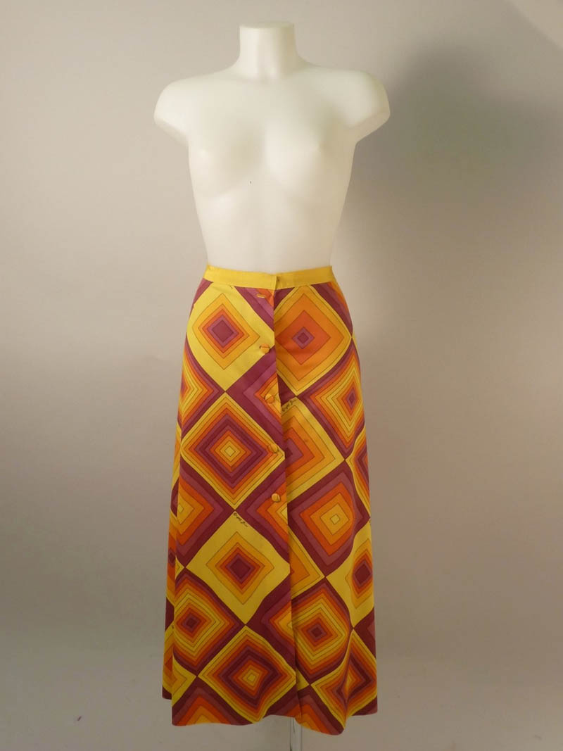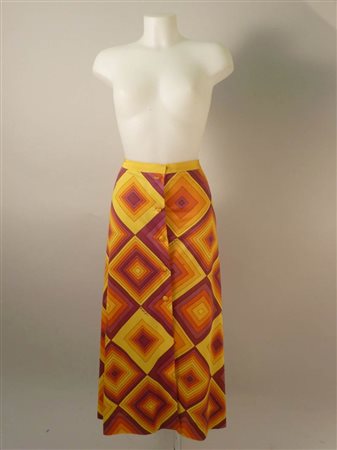 GONNA IN TESSUTO FANTASIA - PATTERNED SKIRT Argos Dini Anni Settanta linea svasata, apertura frontale con bottoni rivestiti, fantasia optical nei toni del giallo viola e arancio, macchie tg L circa