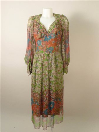 ABITO IN CREPE DI ORGANZA A FANTASIA FLOREALE - DRESS IN FLORAL PATTERN scollo a V, corpino ripreso al seno, manica lunga tg M circa
