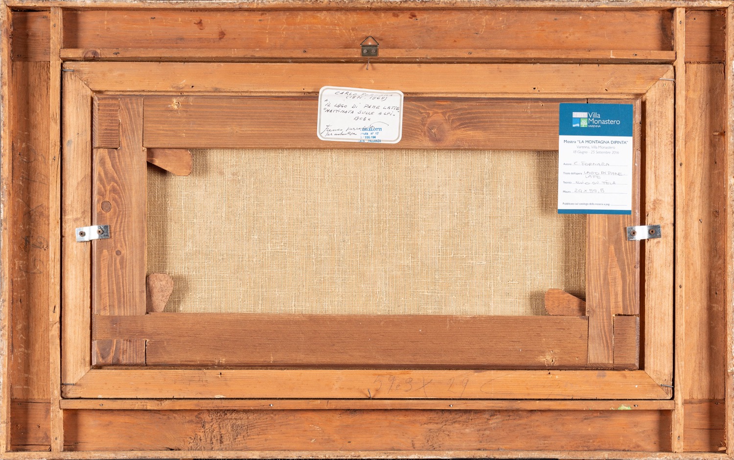 al retro, sul telaio, timbro ed etichetta per autentica di Franco Vercelotti ed etichetta della mostra La montagna dipinta, Varenna, Villa Monastero (18 giugno-25 settembre 2016)