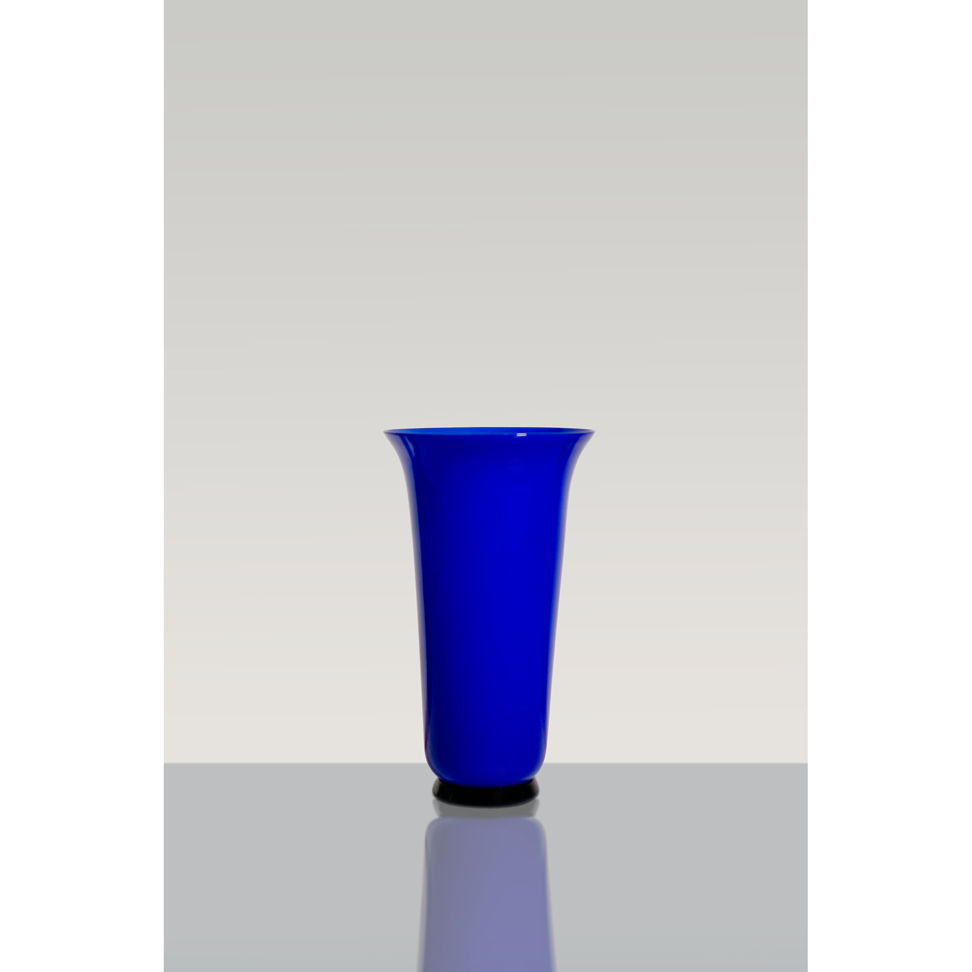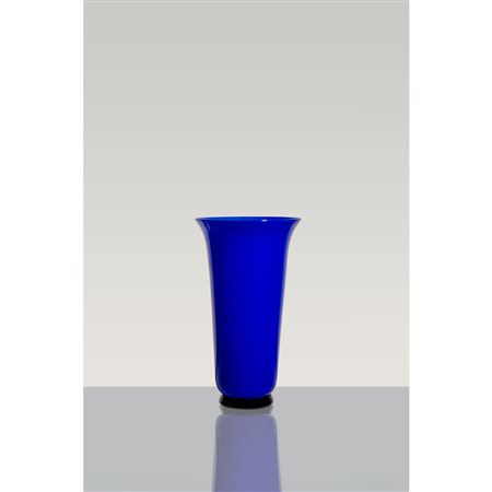 Vaso della serie “Anni Trenta” in vetro soffiato opalino nei toni del blu, su base in pasta vitrea nera, 1992; diametro cm 15,5; altezza cm 27,4. Reca etichetta: Venini Murano made in Italy. Firma incisa: Venini 92