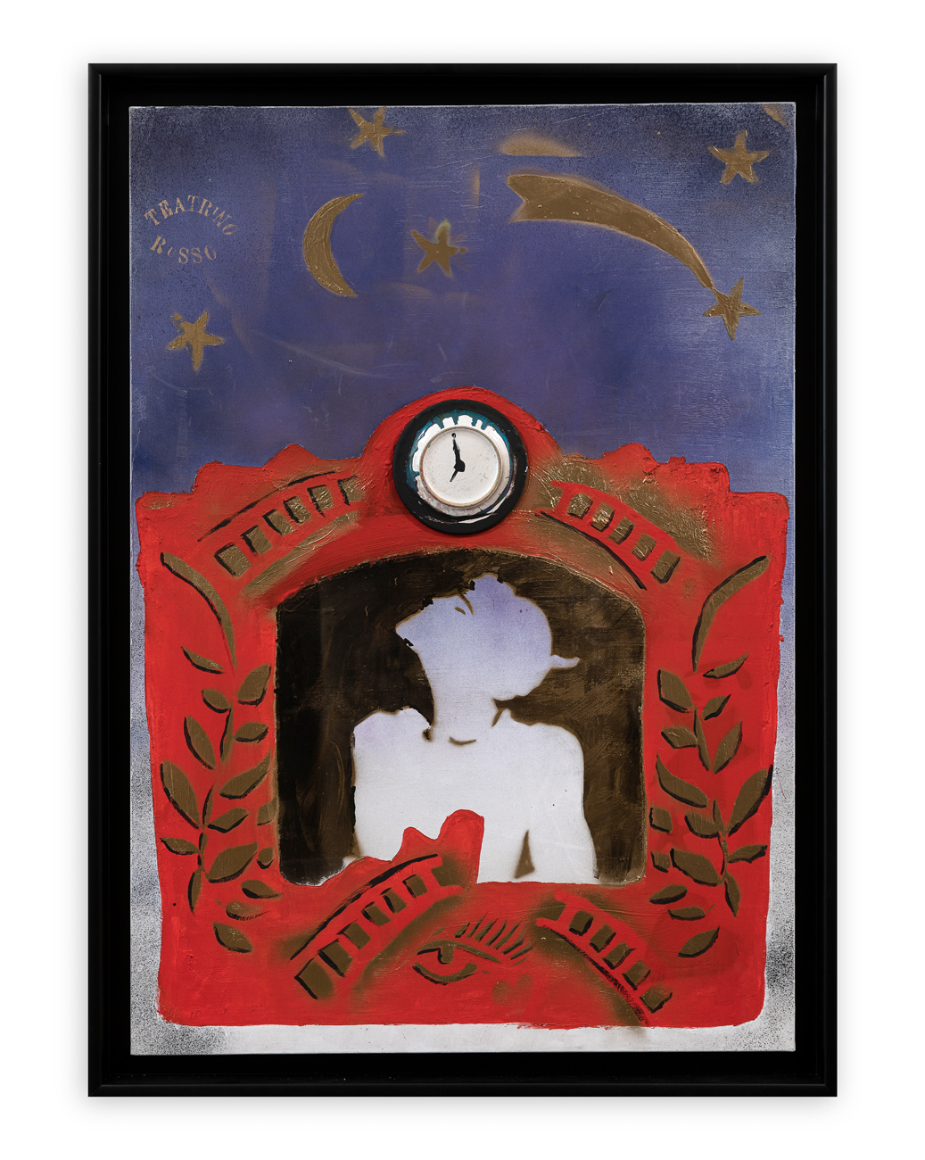 Smalto, acrilico, spray e collage (ceramica) su tela