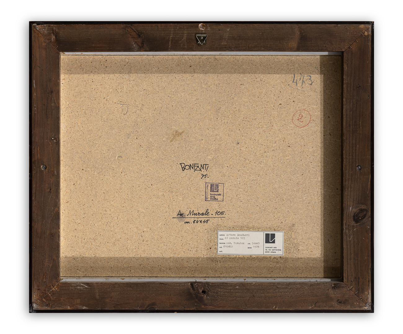 Etichetta della Galleria Lorenzelli (MI), con caratteristiche tecniche dell'opera, al retro