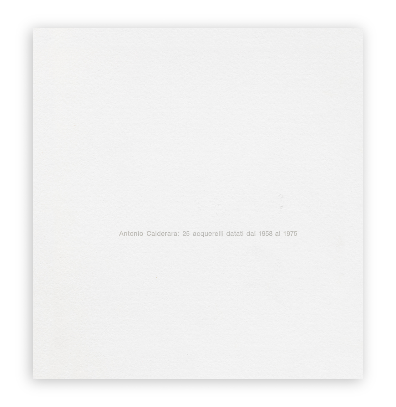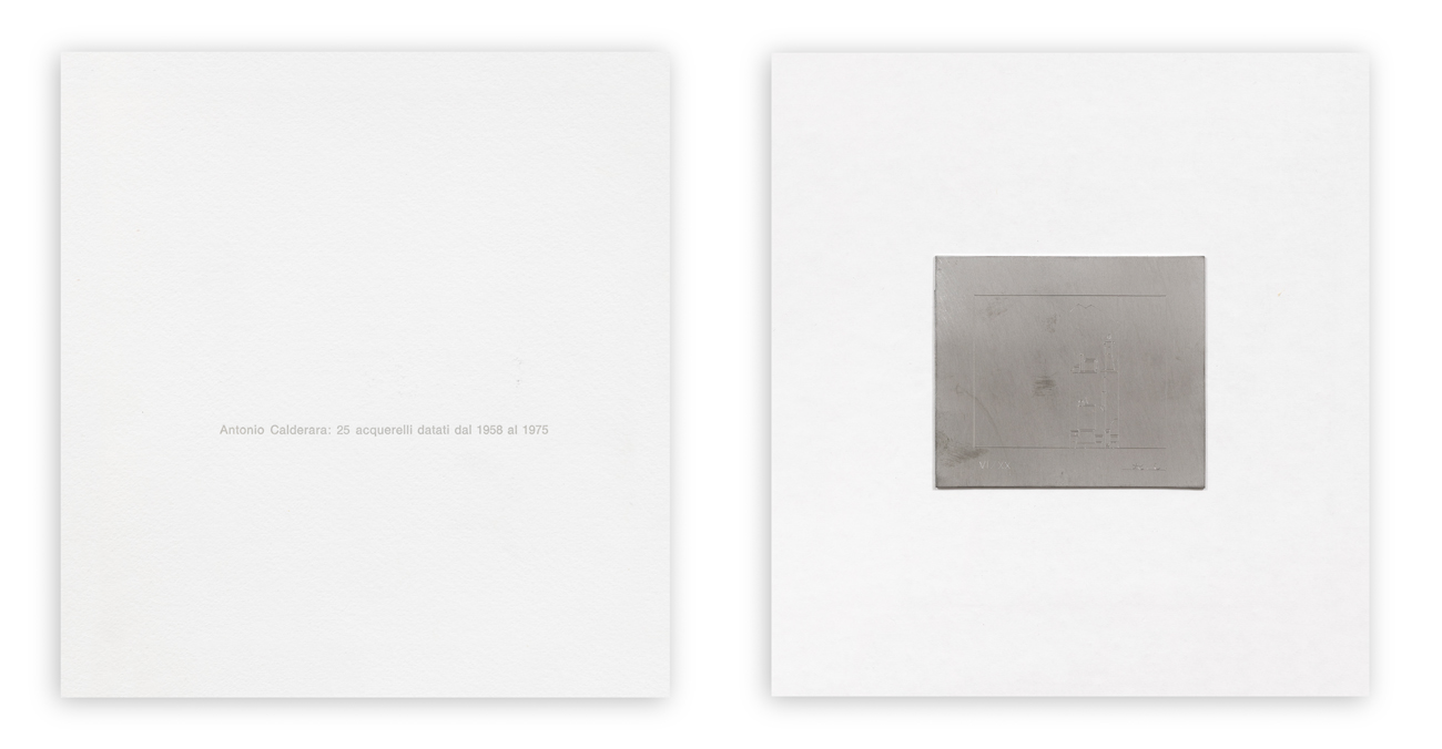Edizione d'arte contenente il volume riccamente illustrato 'Antonio Calderara: 25 acquerelli datati dal 1958 al 1975' (Vanni Scheiwiller Editore, Milano, 1975) e una incisione su peltro di Antonio Calderara recante firma e numerazione (Esemplare VI/XX) incise al fronte