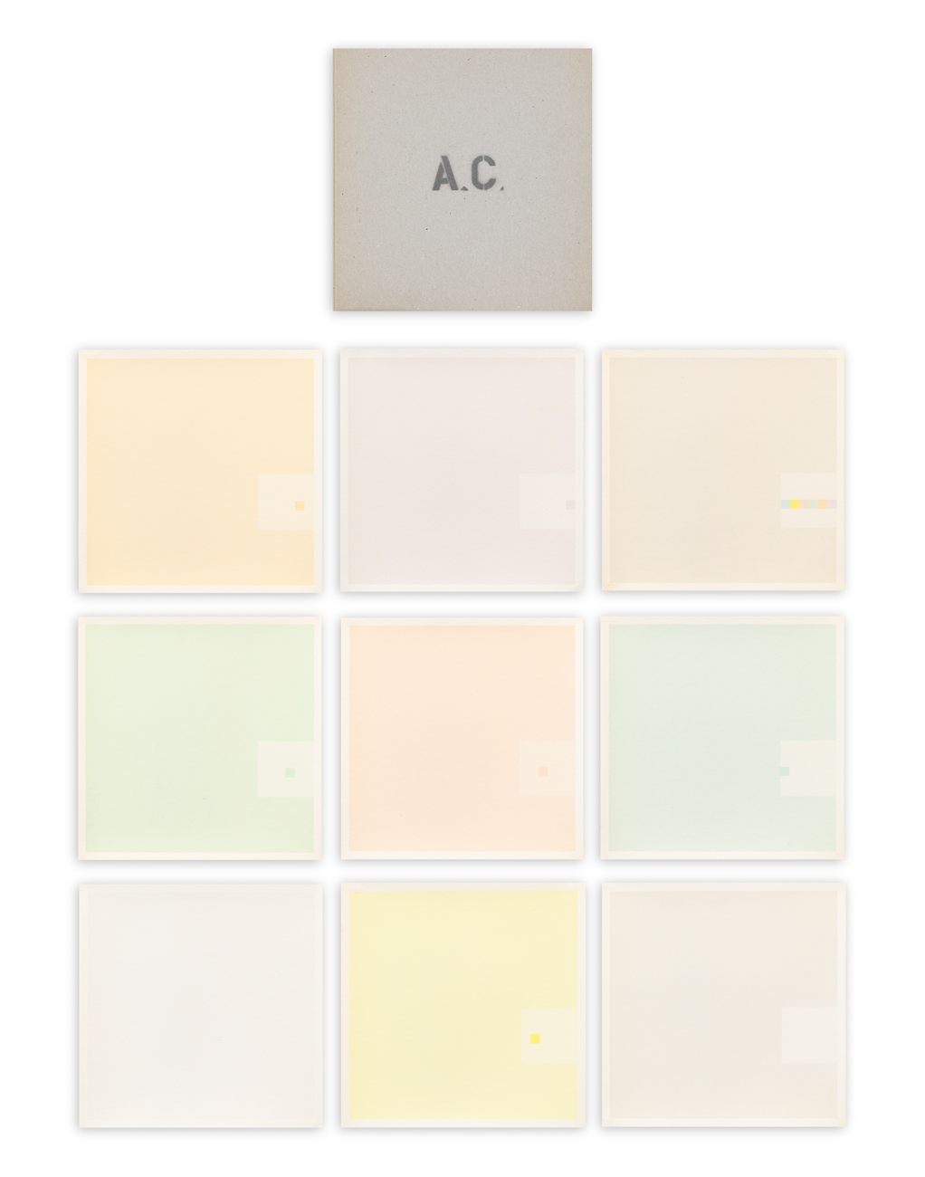 Cartella contenente 9 serigrafie di Antonio Calderara, ciascuna recante firma, datazione e numerazione (Esemplari XVII/XXX) a matita al retro