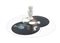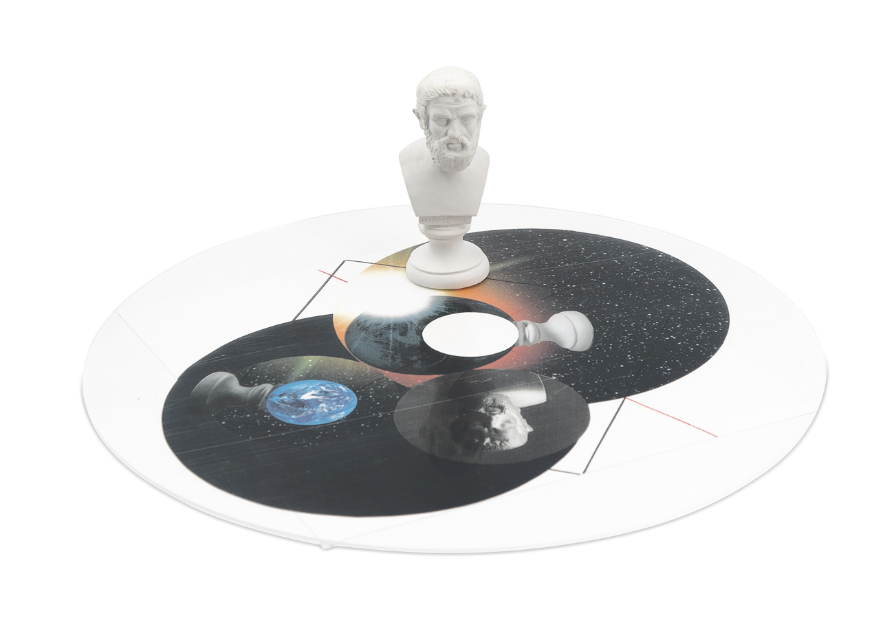 Multiplo composto da 1 stampa litografica a colori su cartoncino fustellato (cm 34x41), 1 lastra di plexiglass trasparente (diam. cm 47) e 1 calco in gesso (cm 14,5)