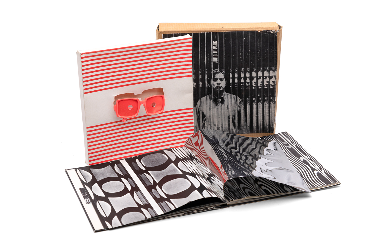 Edizione d'arte contenente un catalogo riccamente illustrato con fotografie di Julio Le Parc e testi di Enzo Mari e Julio Le Parc, ed una scatola in cartone a sua volta contenente paio di occhiali in plastica e cartoncino protetti da un cartone rigido sagomato