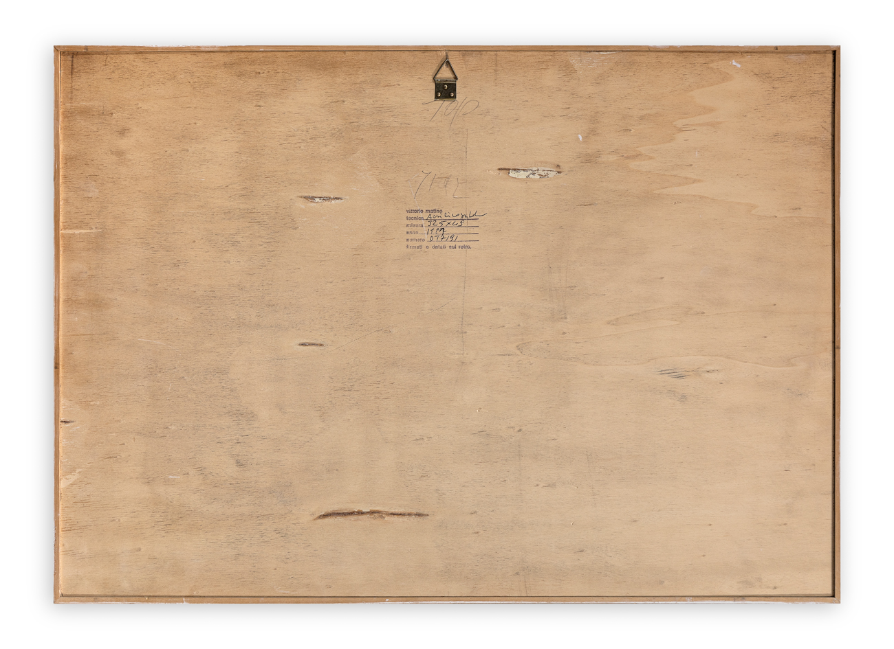 Timbro dell'Artista con tecnica, misure, datazione, numero di repertorio e indicazione della firma e della datazione al retro della tavola protettiva