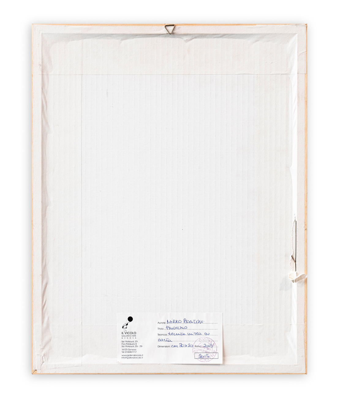 Etichetta e timbro della Galleria Il Vicolo (GE) al retro del cartone protettivo
