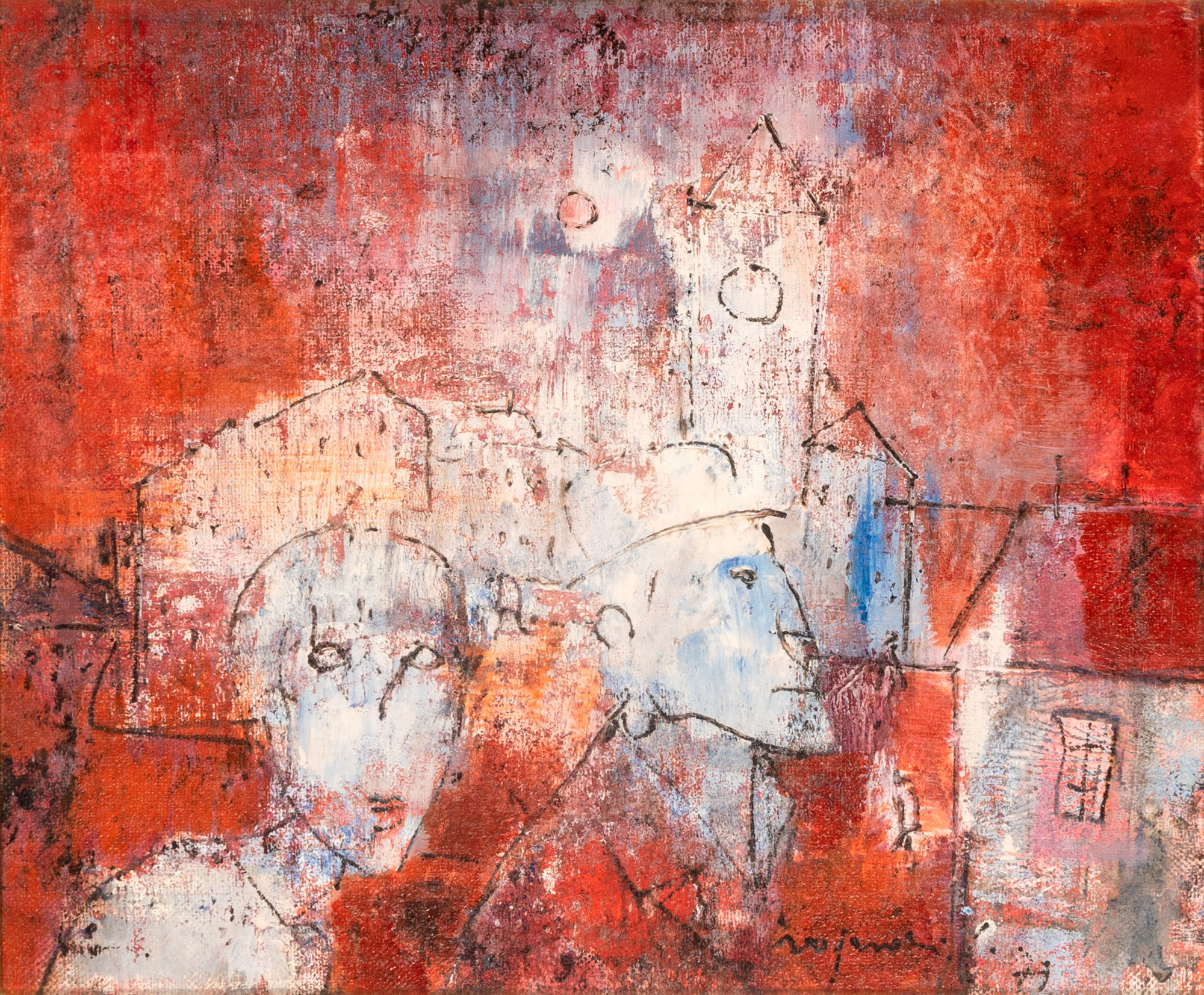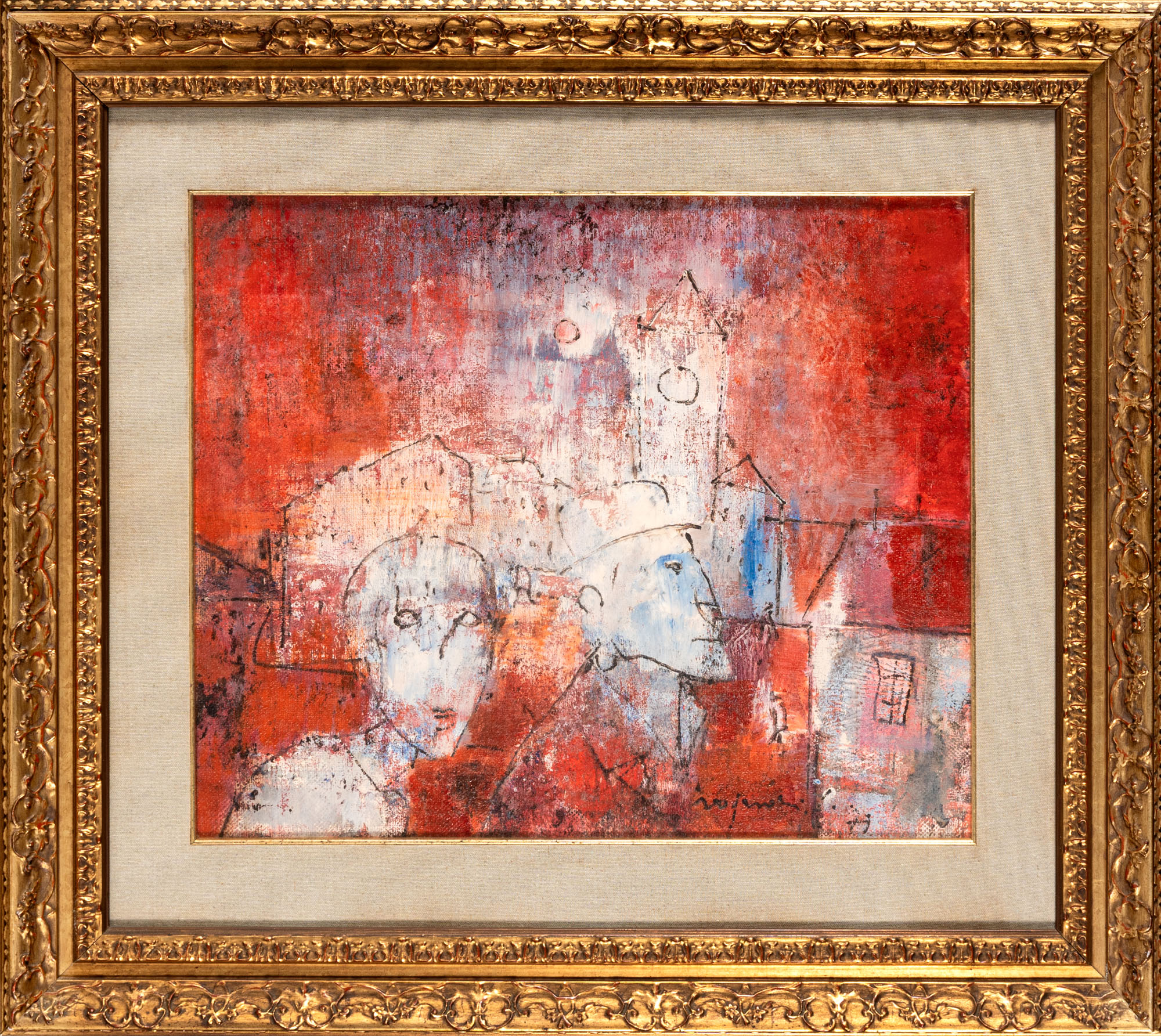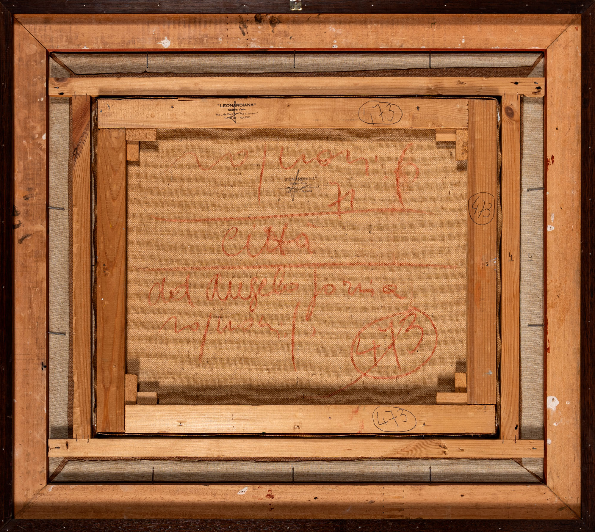 FRANCO ROGNONI(1913 - 1999)Città1971Olio su tela46,5 x 55 cmFirmato e datato in basso a destraFirma, data, titolo e dedica al retroPROVENIENZA:Leonardiana Galleria d'Arte, Alassio (timbro al retro)Collezione privata, Biella