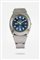 Cassa in acciaio con fondello a vite. Quadrante blu soleil con indici geometrici applicati, indicazione della data al 3 e del giorno della settimana al 9.