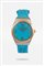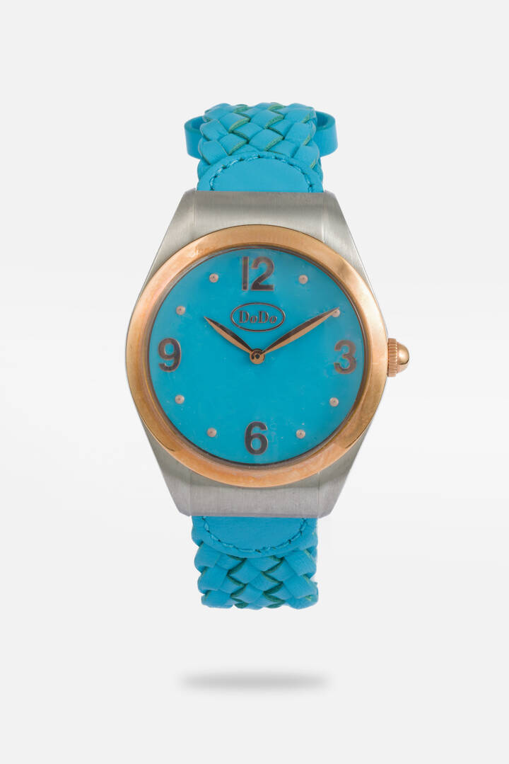 Cassa in acciaio con corona e lunetta in oro rosa 9 Kt. Quadrante turchese con numeri arabi ai quarti e indici geometrici. Cinturino in pelle intrecciata color turchese