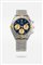 Quadrante blu con indici geometrici luminescenti, secondi continui al 9, 12 ore al 6 e 30 minuti cronografici al 3.