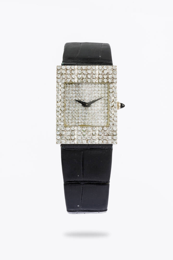 Cassa in oro bianco di forma rettangolare con anse nascoste. Carrure e quadrante in diamanti.