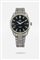Quadrante nero con indici geometrici applicati, indicazione centrale dei secondi continui e datario al 3.
